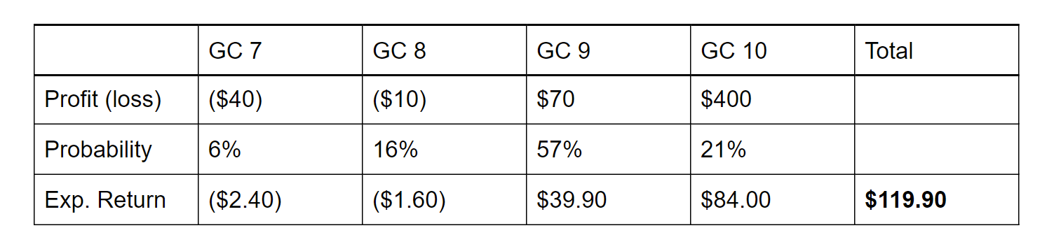 This information allows us to calculate the expected return of submitting a Card X to GradeCo using some basic Expected Value math [NB: the math is the same regardless of how you acquire your raw Card X. Either you buy it for $100 or you pack it yourself in which case you could sell it for $100 but you don’t]: