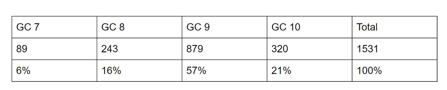In the weeks after I sell my GC10, hundreds of people will submit Card Xs to GradeCo and a couple things will happen. First, prices for GC8, GC9, and GC10 graded cards will start to settle. Second, the population report will begin to reveal how difficult it is to get each grade.