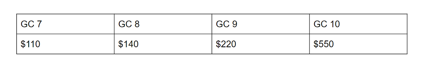 Now, when you submit Card X (a card from this year) to GradeCo, it will receive a number grade on a 1-10 scale (whole numbers only). So now what happens? Let’s say I submit my Card X and it gets a GC10 (GradeCo 10). “Amazing,” I think. I better get this thing listed up on eBay and sold. There are no comps because it’s the first one ever graded so I just list it as an auction and it sells for $800. Score! I made $650 ($800 - $100 (raw card) - $50 (cost of grading)).